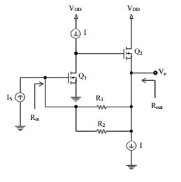 三、下圖所示之反饋電路,其中兩個電晶體的特性相同,同時皆有I = 1 mA之理想電流 偏壓,電晶體工作於VOV(overdrive voltage)= 0.2 V,另外V