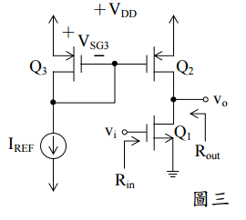 三、如圖三所示為一 CMOS 共源(CS)放大器,設各電晶體均偏壓於飽和區。電晶體 Q