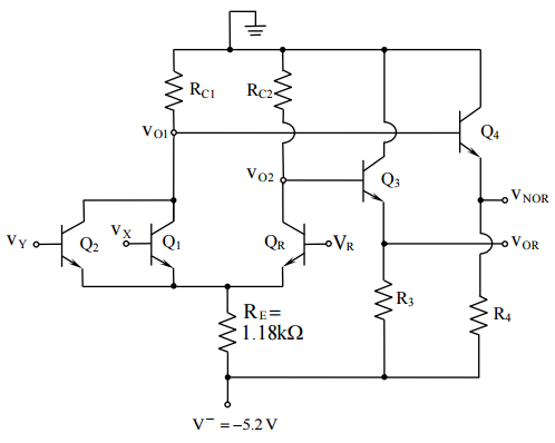 五、如圖五的 ECL 邏輯閘電路,設各電晶體之β極大,其 I B 0 , VBE ( on ) 0.7V 。此電 路之各輸入電壓與各輸出電壓間分別具有相同的邏輯 0 電位與邏輯 1 電位: