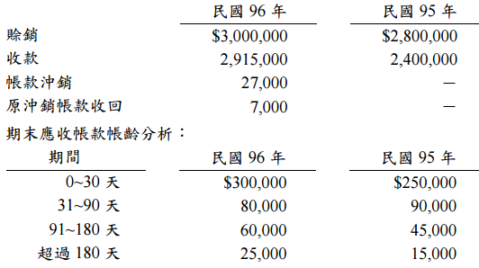 此外,甲公司會將超過一年之應收帳款全部沖銷,又有關甲公司在民國 96 年與 95 年的相關資訊如下: