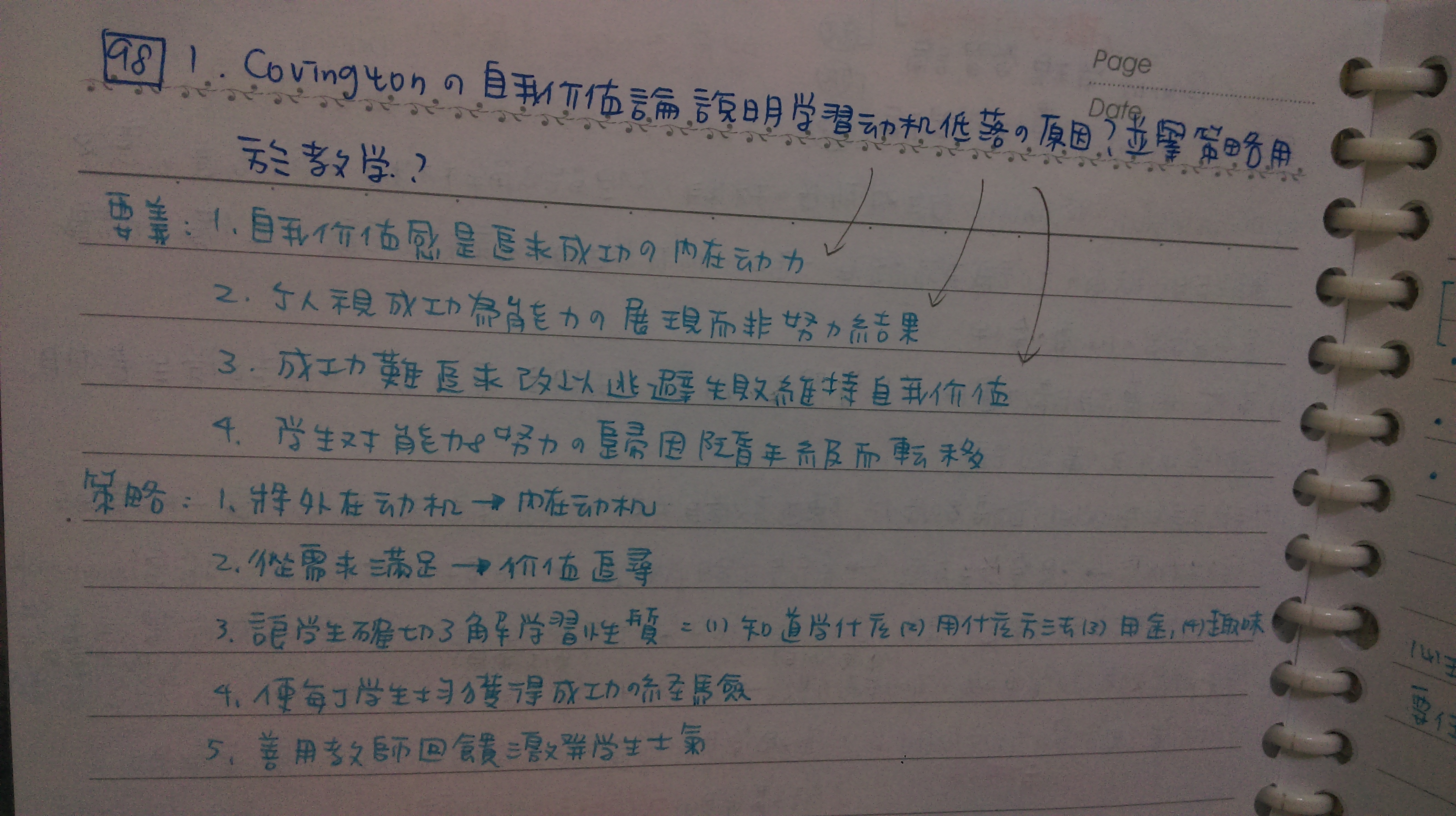 5、教導遇挫折時的正確歸因:遇到失敗時,可以嘗試歸因於內在不穩定(努力),進而告訴學生更努力就有機會成功。卡芬頓的自我價值論 1.自我價值感是個人追求成功之內在動力 2.個人視成功為能力之展現而非努力之結果 3.成功難以追求因而改以逃避失敗維持自我價值 4.學生對能力與努力之歸因隨年級而轉移 學習動機低落可能是因為 覺得自己再怎麼努力也於事無補,因為先天就不足所以注定無法得到成就。 激發動機的策略 提供內在或外在的增強物,給予心靈與實質上的鼓勵;採用漸進式目標,先設立只要簡單的小目標,使學生能得到成就感。
