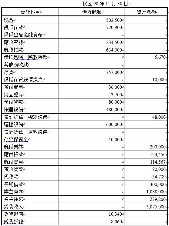 二、世界商店成立於97年1月1日,98年12月1日採會計電腦化,該商店的會計處理情形如下: 1. 截至98年11月底世界商店所採用的會計科目及各帳戶餘額如下表所列。 2. 商店採曆年制,記帳基礎採權責基礎(先實後虛法),期初未作轉回分錄。 3. 存貨處理採實地盤存制。 4. 本試題不考慮營業稅。 5. 金額計算至元位止,以下四捨五入。 6. 本題報表呈現請依試算表科目(不得增設科目)順序作答。 7. 會計人員(製表人):acc 試作世界商店98年12月份之更正及調整分錄。 05日 收回98年9月份沖銷之應收帳款$200,000(請作兩分錄)。 07日 以每股$103之價格另加手續費$500購入欣欣公司股票1,000股作為備供出售金融資產短期之股權投資。 15日 現銷商品$150,000。 28日 會計人員發現11月誤將銷貨折讓$1,000誤記為銷貨運費。 應調整事項 1. 本年度期末盤點存貨$468,000(採銷貨成本法,限做一分錄)。 2. 本年4月30日支付1年期保險費$36,000 3. 本年8月1日因銷貨而收到六個月期,附年息一分。面額$150,000之本票乙紙。 4. 機器設備係於97年7月1日購入;運輸設備係於本年9月1日購入;耐用年限均為5年,無殘值,採平均法計提折舊(限作一分錄)。 5. 本年11月1日進貨開出三個月期,附年息6%,面額$100,000之本票乙紙。 6. 本月份員工薪資$30,000,將於次月支付。 7. 年底收到報社寄出之12月份報費繳款通知$240。 8. 依銷貨收入淨額之1.2%提列呆帳損失。 9. 文具用品年底盤點尚餘$2,500未耗用。