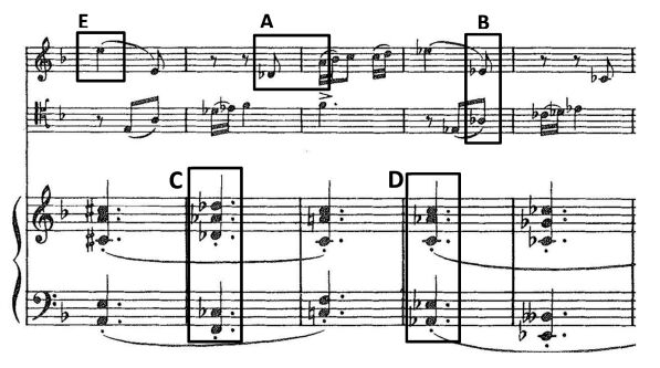 15.此譜例皆以實際音高記譜。若將方框E的音高交由降B調單簧管演奏,其記譜音之音名應為?