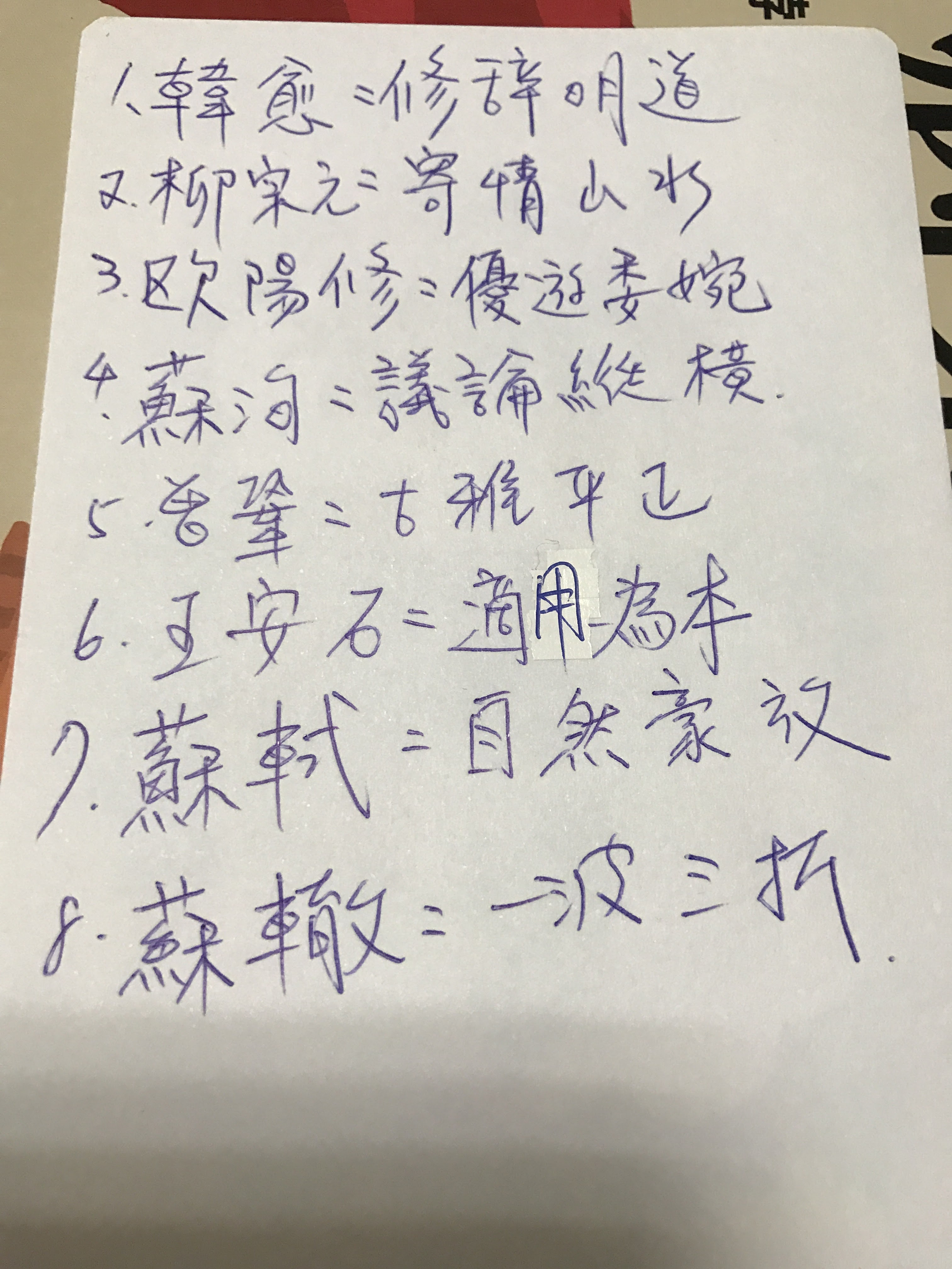 韓愈 倡導語言樸實 型式自由的古文 反對華而不實的駢文 主張 <文以載道> 文風:氣勢雄健 語言精鍊 柳宗元 主張<文以明道> 擅寫寓言作品 以幽默諷斥的筆法 反映嚴肅主題 文風:雄深雅健似司馬子長 歐陽脩 主張<明道致用> 反對宋初浮豔晦澀的文風 文風:說理平易 抒情委婉 蘇洵 文章得力於戰國策 史記 長於議論 文風:古勁簡直 抒情委婉 蘇軾 主張<因文以求道> 文章得力於戰國策 史記 孟子 縱橫家言 文風:汪洋宏肆 詞理精確 蘇轍 論文重視養氣(認為文是氣的表現 養氣是文章的根源) 文風:汪洋淡泊 詞氣高妙 王安石 主張以<適用>為本 充滿實用主義色彩 文風:文風峭拔 筆力雄健 曾鞏 文章內容著重當世時務 言古今治亂得失 是非成敗之理 為文原本六經 崇尚平易 文風:氣勢縱橫 跌宕多姿