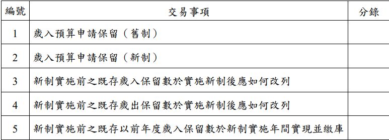 二、普通公務單位會計制度之一致規定(以下簡稱舊制)及中央政府普通公務單位會計制度之一致規定(以下簡稱新制),對於歲入、歲出保留數之會計處理存有差異,請依下列交易事項,列出應有之分錄。(如無分錄亦請註明,否則不予給分)