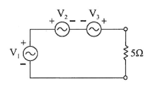 2.如圖所示電路,\( V_1=60\sin(t) \),\( V_2=60\sin(t+60°) \),\( V_3=80\sin(3t) \),試求5Ω電阻所消耗的平均功率 \( P_{5\Omega} \) = ___ W