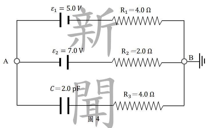 2. 如圖4所示電路,兩個電源分別是:\( \varepsilon_1 = 5.0 \) V,\( \varepsilon_2 = 7.0 \) V,三個電阻的數值分別是:\( R_1 = 4.0 \) Ω,\( R_2 = 2.0 \) Ω,\( R_3 = 4.0 \) Ω,另有一個電容 \( C = 2.0 \) pF。電池的內電阻可以忽略,B點是參考點接地,在充電完畢後: