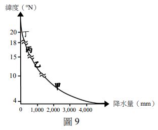二、 圖 9 四個線段分別為非洲幾內亞灣以北,甲、乙、丙、丁四個區域的降水量與緯度分布關係圖。請問: