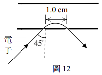 二、以一對分別帶有等量正負電荷的平行板作為電子的轉向裝置, 其中帶正電的下板挖有相距 1.0 cm 的兩個小縫,側視圖如圖 12 所示。設有一電子以 4.55