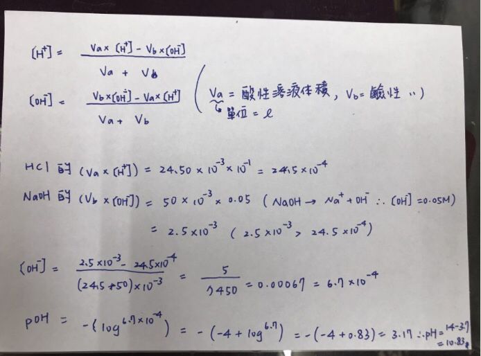 20.以 24.50 mL pH 值為 1 的 HCl 溶液滴定 50 mL 濃度為 0.05 M 的 NaOH 溶液,試問此時 pH 值 為______。(log 1.49 ൌ 0.17、log 6.71 ൌ 0.83,計算至小數點後第 2 位,以下四捨五入)