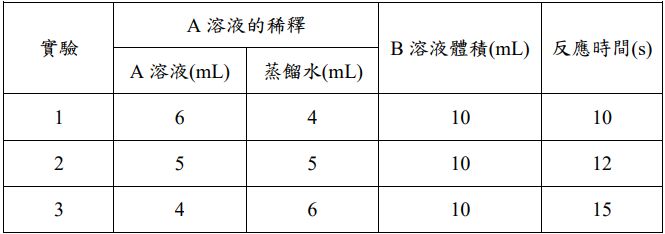 21-22 為題組:在秒錶反應的實驗中,A 溶液為 0.02 M 的碘酸鉀溶液,B 溶液為 0.01 M 的 亞硫酸氫鈉的硫酸溶液(內含澱粉)。在 25℃下,取不等量的 A 溶液先加蒸餾水稀釋至體積 為 10 mL,再與 10 mL 的 B 溶液混合反應,測量反應完成所需的時間,如附表。