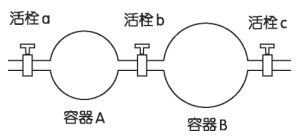 氣體丁:將氯化銨和氫氧化鈣混合加熱反應後於常溫常壓下的氣體產物 並將體積 2 升的玻璃容器 A 和體積 3 升的玻璃容器 B 連接,如附圖所示。