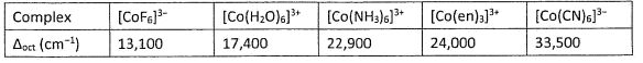 24. The following table gives the octahedral crystal field splitting energy (Δo) values for Co(III) complexes. Explain the order in terms of the σ- and π-donor and σ- and π-acceptor properties of the ligands. (10%)