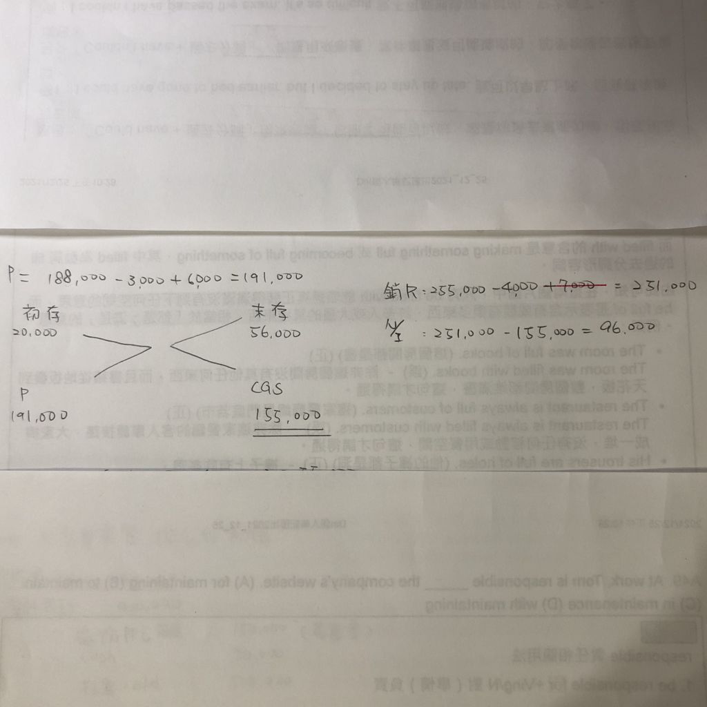 銷貨淨額:255,000-4,000 = 251,000銷貨成本:20,000+(188,000-3,000+6,000)-56,000 = 155,000銷貨毛利:251,000 - 155,000 = 96,000注意:銷貨運費是營業費用