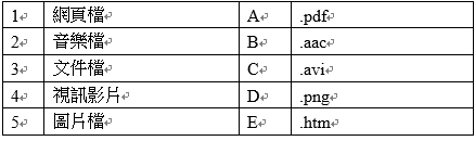二、 填充題 (共21題,第1~12題,每題1分,第13~21題,每題2分,共計40分) I 請將下列開放格式的副檔名填入正確的分類