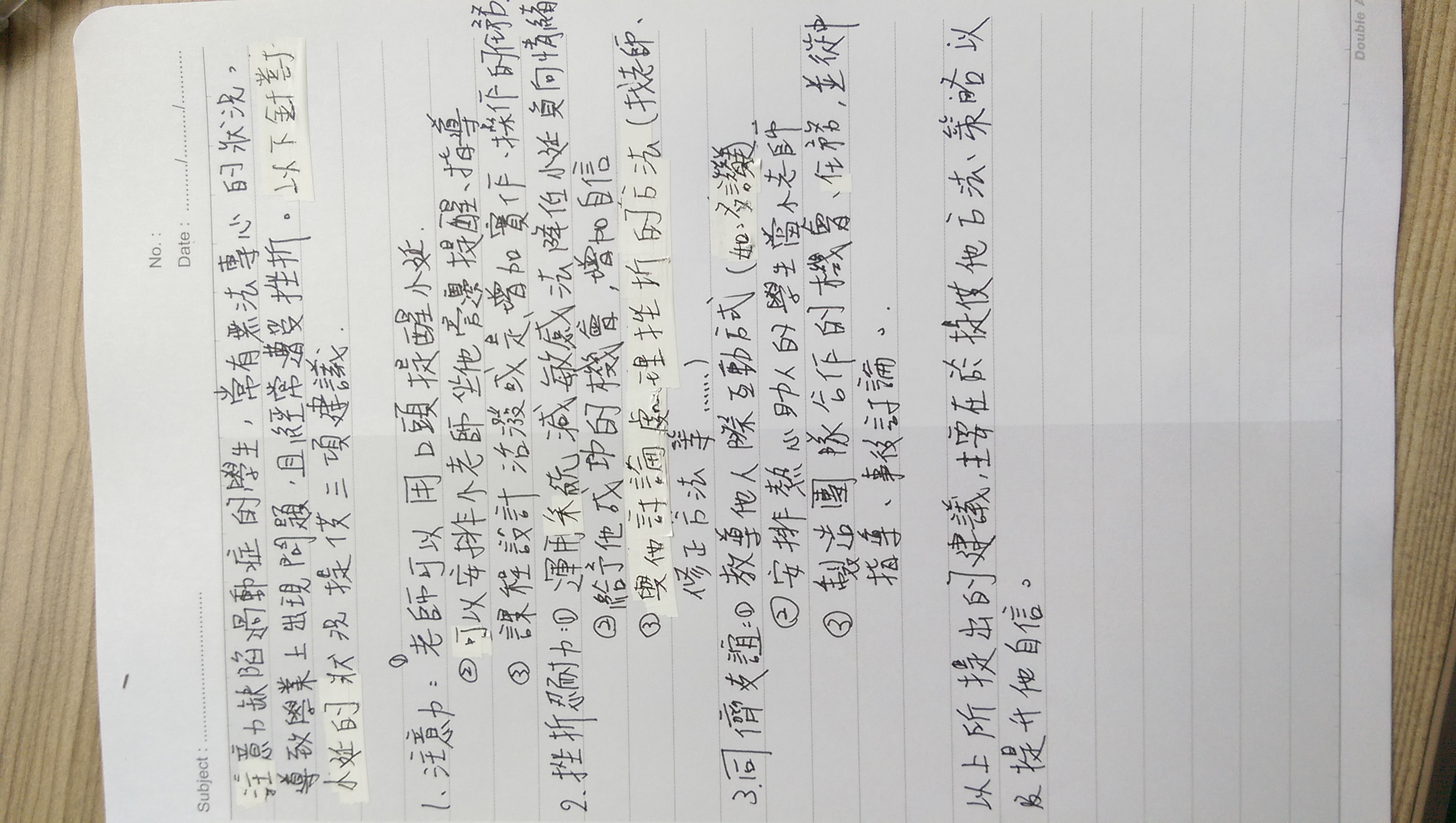 (1)注意力: 1學生如注意力不集中,教師可適時叫學生的名子或製造任務給該生表現,讓學生融入課程並更有參與感。 2可用口頭讚美當作增強 (2)挫折容忍力 1當學生情緒來時,先告訴學生我們ㄧ起解決問題,先平復學生的情緒,告訴學生深呼吸,遇到不如是的事情要先告知導師,導師會'幫他解決 (3)同儕友誼 1當學生在資源班表現良好,可以邀請班上的同學到資源班一起玩遊戲 2在班上教育注意力缺陷過動症或特殊學生可能會發生的情形,播放小影片讓全班學生思考 3上課採合作學習模式 4安排社交技巧的課程與活動