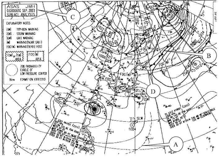 3. ( C )箭頭所指的氣象傳真圖之種類,及其說明(全文如下)的意思?ASAS, JMH, 030000 UTC, SEP. 2023, SURFACE AN ANALYSIS