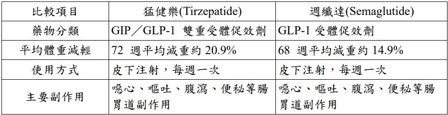 (一) 猛健樂(Mounjaro)和週纖達(Wegovy)等「瘦瘦針」近來受到高度關注,下表是一張網路上常見的瘦瘦針比較表,請回答下列問題: