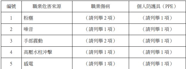 您是受僱於某營建工程公司的職業安全衛生管理人員,因公司擬引進壓力最高為 1000 bar 的水刀(water jetting,1 bar = 1.019716 kg/cm2 ),進行混凝土切割作業,若使勞工從事此項 作業,試就下表內可能的職業危害來源,填寫其可能造成之職業傷病及應提供之個人防護 具於答案卷。