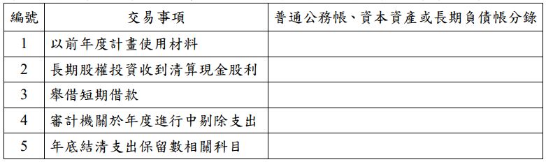 二、請依中央政府普通公務單位會計制度之一致規定,列出下列各類交易事項應有之分錄。 (回答問題時應同時註明所屬之帳類及相關分錄,否則不予給分)(25 分)