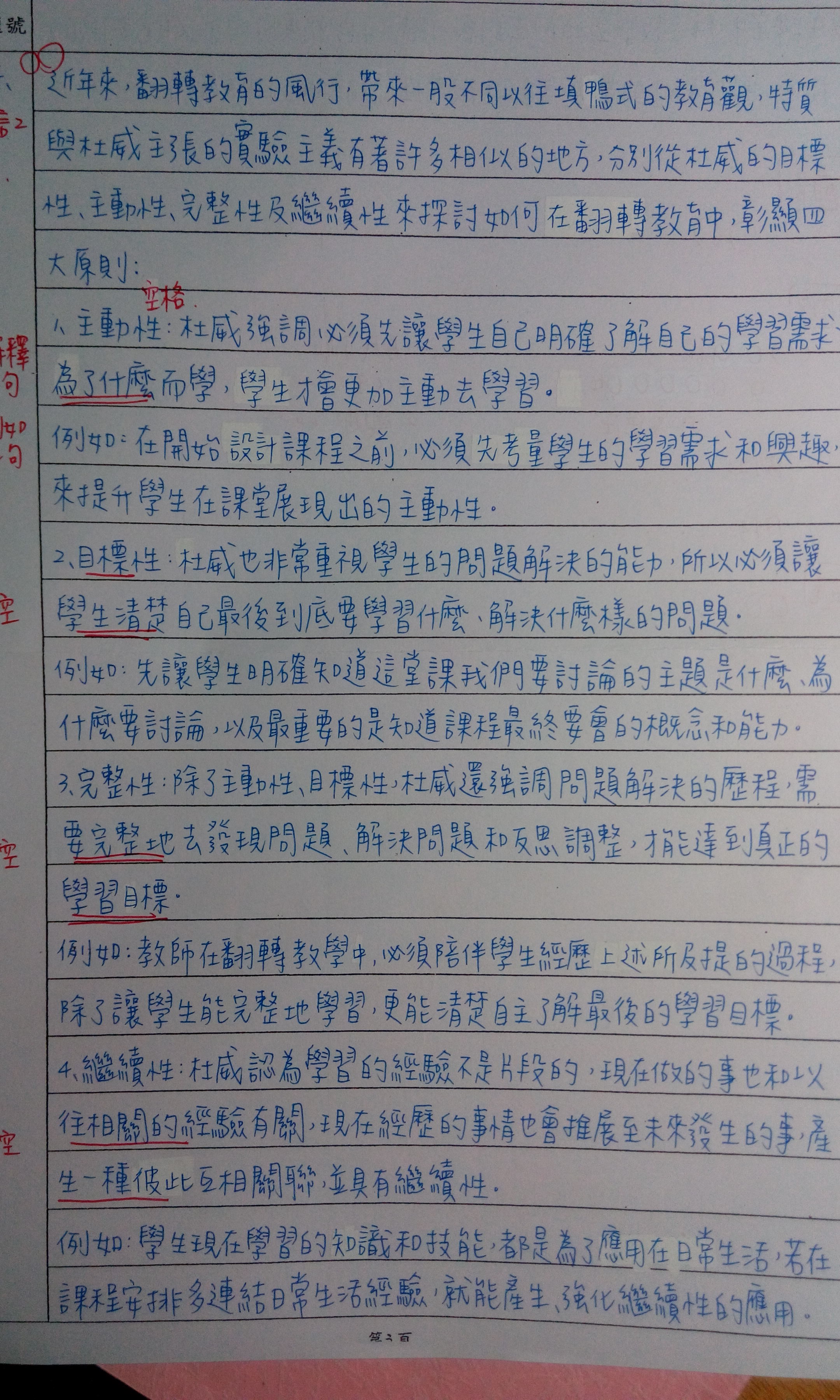 2. 主動性 : 杜威強調當老師灌輸者的角色轉換成引導者,學生也會從旁觀者轉變成參與者,在山茶國中的教學中,反映在學生一同為了達成目標而討論學習。