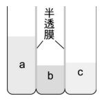 5. 三個形狀相同之容器以半透膜部分相通(水分子能通過而溶質則否)。今在容器a內加入2.0升0.10 M BaCl₂水溶液,容器b內加入1.0升0.20 M NaCl水溶液,容器c內加入1.1升0.30 M葡萄糖水溶液。剛加入時各容器之液面高低如附圖。若忽略液面高度差異所產生的壓力,當達平衡時,三溶液的體積莫耳濃度比(a:b:c)為________。