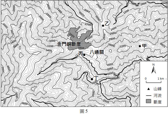 52-53 為題組 金門峒斷崖是民眾攀登玉山時常會經過的地點,其位於八通關草原的西側,屬於 濁水溪支流—陳有蘭溪的源頭。該處岩性以軟弱的板岩為主,抗蝕力差,故形成大面積 崩壞,是作為戶外地形教室的良好案例。圖 5 為金門峒斷崖位置圖。請問: