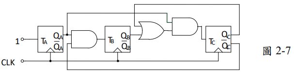 7. 請問圖2-7,假設T型正反器QA, QB, QC之初始值為000,進入6個CLK後的QA, QB, QC之值為?______________
