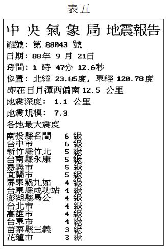 去 年 9 月 21 日清晨,台灣發生集集大地 震,當時離震央不遠的南投中寮高壓變電 所,因大地震而嚴重受損,造成依賴南電北送的北部地區大停電。北部有些深夜未入睡 的居民,察覺到先停電之後,再感受到天搖 地動。中央氣象局依據各地觀測站的資料, 測得震央位置,並發布地震報告如表五。位 於斷層帶的災情陸續傳來,死亡及受困人數不斷增加。有少數災民在被困數日之後,才 陸續獲救。這些倖存者被緊急送到醫院之 後,除了身體虛弱之外,由於長時間缺乏飲水,醫生特別擔心倖存者腎功能是否正常。 事隔多日,災情逐漸受到控制,而人們開始好奇,是否有些異象能預測地震的發生,例 如在少數地方就曾報導在地震發生前數日, 有地底泥漿伴隨氣泡湧出地表的罕見景觀。 試依以上敘述,回答 70 至 77 題: