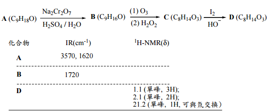 三、依下列反應轉化及所提供的光譜資料,請寫出 A~D 的結構式。(A、B 各 2 分,C、D 各 3 分;共 10 分)