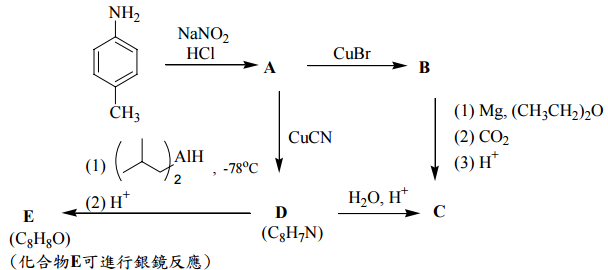 五、寫出下列所示各反應產物 A 至 E 的結構。(10 分)