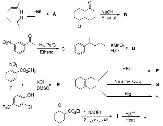 三、請畫出下列反應式的主要產物結構(A~J)。