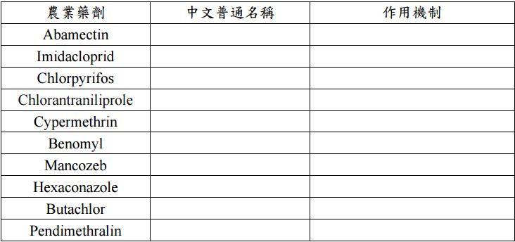 二、請寫出下列農業藥劑的中文普通名稱(每小題 1 分),並簡述其作用機制(每小題 2 分)。(30 分)