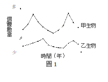 【已刪除】圖1為近12年某生態系中,有互動關係之甲、乙兩種生物個體數量變化圖。試問甲、乙最可能為下列哪一組生物?