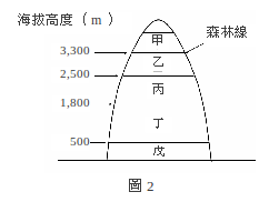 【已刪除】圖2為玉山海拔高度的剖面示意圖,甲~戊分別代表不同的生態系。某生態系中的植物以裸子植物為主,其葉子多呈針狀,不常落葉。則該生態系最可能位於圖中何處?