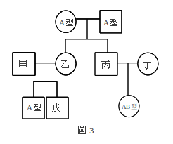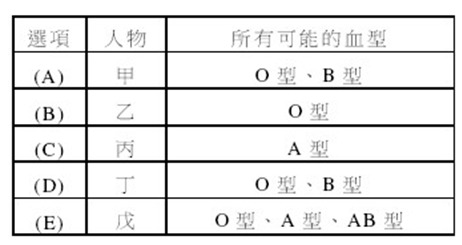 【已刪除】圖3 為某一家人的族譜圖,其中甲、乙、丙、丁及戊的血型未知。下列關於甲~戊「所有可能的血型」之敘述,何者正確?