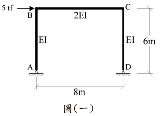 【已刪除】一、圖(一)所示門形剛構架(rigid frame),B 點受水平力 5 tf 作用,試分析此構架, 並繪彎矩圖、剪力圖、軸力圖,並在圖上須標示最大值。(35 分)