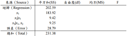 【已刪除】⑶試給出此迴歸分析之變異數分析表,及其 R