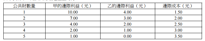 【已刪除】8 假設經濟體系只有兩位成員(甲、乙),他們對使用公共財所產生之邊際利益及政府生產公共財之邊際成本 如下表所示,則公共財最適產量為何?