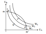 為社會的福利水準,mm' 為總效用 B 可能曲線(Grand Utility Possibility Frontier)。下列敘述何者錯誤? (A) a,b 二點的社會福利水準均相同 UB (B) a,d 二點均是符合經濟效率之點 (C)從經濟效率而言,c 點優於 d 點 m a (D)從社會福利而言,d 點優於 b 點