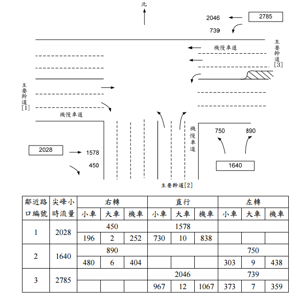 【已刪除】一、請根據下列獨立路口簡圖與表的路口資料設計一定時號誌(Pre-timed Signal),不 限設計方法,請自行假設不足資料,請詳列演算流程與計算步驟。(25 分) [參考資料]Webster 時制計算公式: