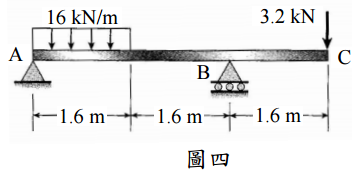 【已刪除】四、有一樑配置如圖四,請繪出此樑之剪力分佈圖與彎矩分佈圖。(20 分)