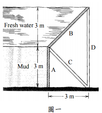 【已刪除】一、圖一為一水壩,此水壩由A牆和B牆所支撐,牆的重量可忽略不計,泥土的密度為 1.6 Mg/m