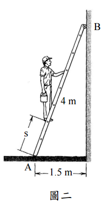 【已刪除】二、請計算圖二中 90 kg 之油漆工爬在梯子上,而此梯子不滑動之最大距離 s。其中,梯 子的重量為 15 kg、長 4 m,梯子上方具有一小滑輪,梯子下方與地面之靜摩擦力係 數為 0.25,此油漆工的質心位於腳部的正上方。(20 分)