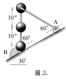 【已刪除】三、有三個完全相同,質量為 m 的圓球擺設如圖三,球與球之間是由 2 支可忽略質量的 棒條來連結。右方支撐的棒條的質量不考慮,兩端的接點處可自由旋轉。假如在 B 處的擋板突然移開,請計算最上方的圓球撞擊到斜板時的瞬間速度 v(注意中間的 圓球相對應的速率為 v/2)。(20 分)