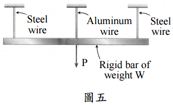 【已刪除】五、一重W=80 lb的剛棒由三條等距的纜繩所固定,材料與配置如圖五所示,鋼纜的直 徑為 1/8 in,鋁纜的直徑為 3/16 in。假設鋼纜所能承受的最大應力為 20,000 psi, 而鋁纜為 12,000 psi,請問可施加之外力P