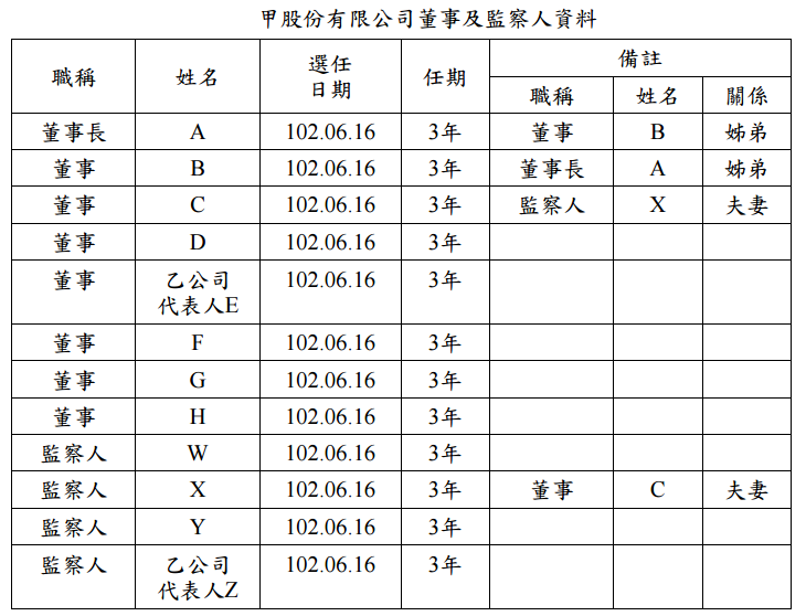 【已刪除】二、甲上市公司於 102 年 6 月中順利選出如下表所列之董監事成員,其是否與證券交易法 規定有未合之處?請分析之。(20 分)
