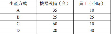 【已刪除】37 下表為興亞毛衣公司每日生產一百件毛衣的可選擇生產方式,如果員工時薪 100 元,機器設備每套使用費用 200 元,若要生產一百件毛衣,何種方式成本最低?