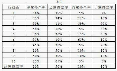 某 內閣 制 國家共有10 個行政區, 各行政區的國會議員選舉投票結果如表1 所 示。如果該國國會總共有20 個席次, 政黨代表與地方選區席次各半, 並且各 自計算; 其中, 選民可投二票, 一票投給政黨, 一票投給選區候選人。