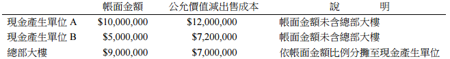 【已刪除】12 甲公司擁有現金產生單位 A 與 B 並共用資產總部大樓,相關資產之公允價值減出售成本大於使用價值, 其餘資料如下,請問總部大樓應認列多少減損損失: